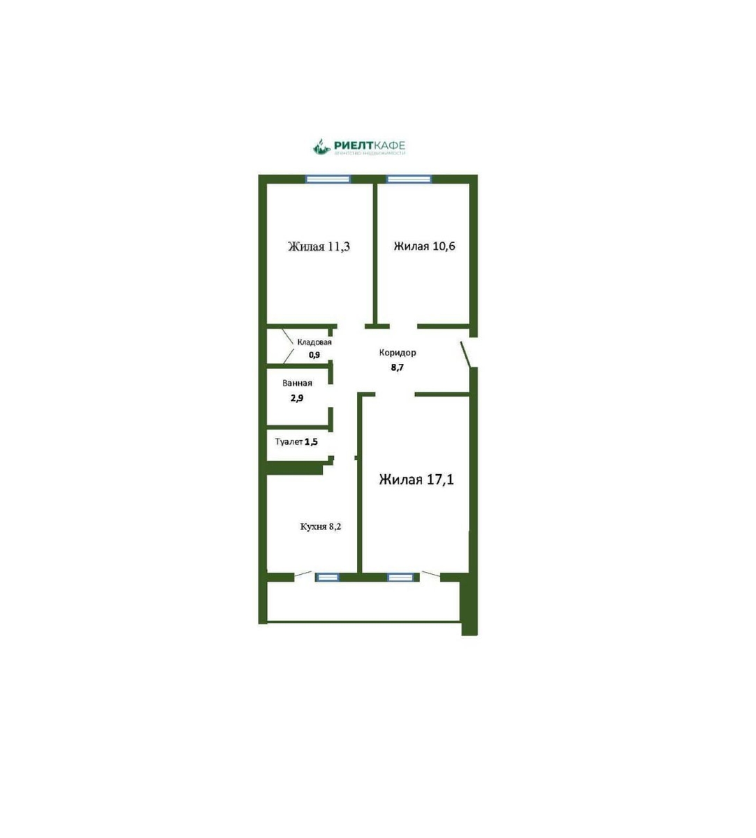 Преимущества квартиры: Общая площадь - 62,7 м2, три изолированные комнаты: 17,1 м2, 11.3 м2, 10,6 м2, кухня – 8,2 м2. Застекленная лоджия-выход из кухни. Ванная 2,9 м2 и туалет 1,5 м2 раздельные, кладовая комната - 1,5 м2. Окна – стеклопакеты, выходят на разные стороны. Красивый вид из окна. Квартира не угловая, очень тёплая