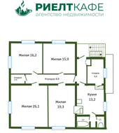 В доме: 4 жилые комнаты, кухня, санузел, кладовая. На цокольном этаже расположен гараж, кладовая и котельная. Под крышей имеется дополнительное помещение.
