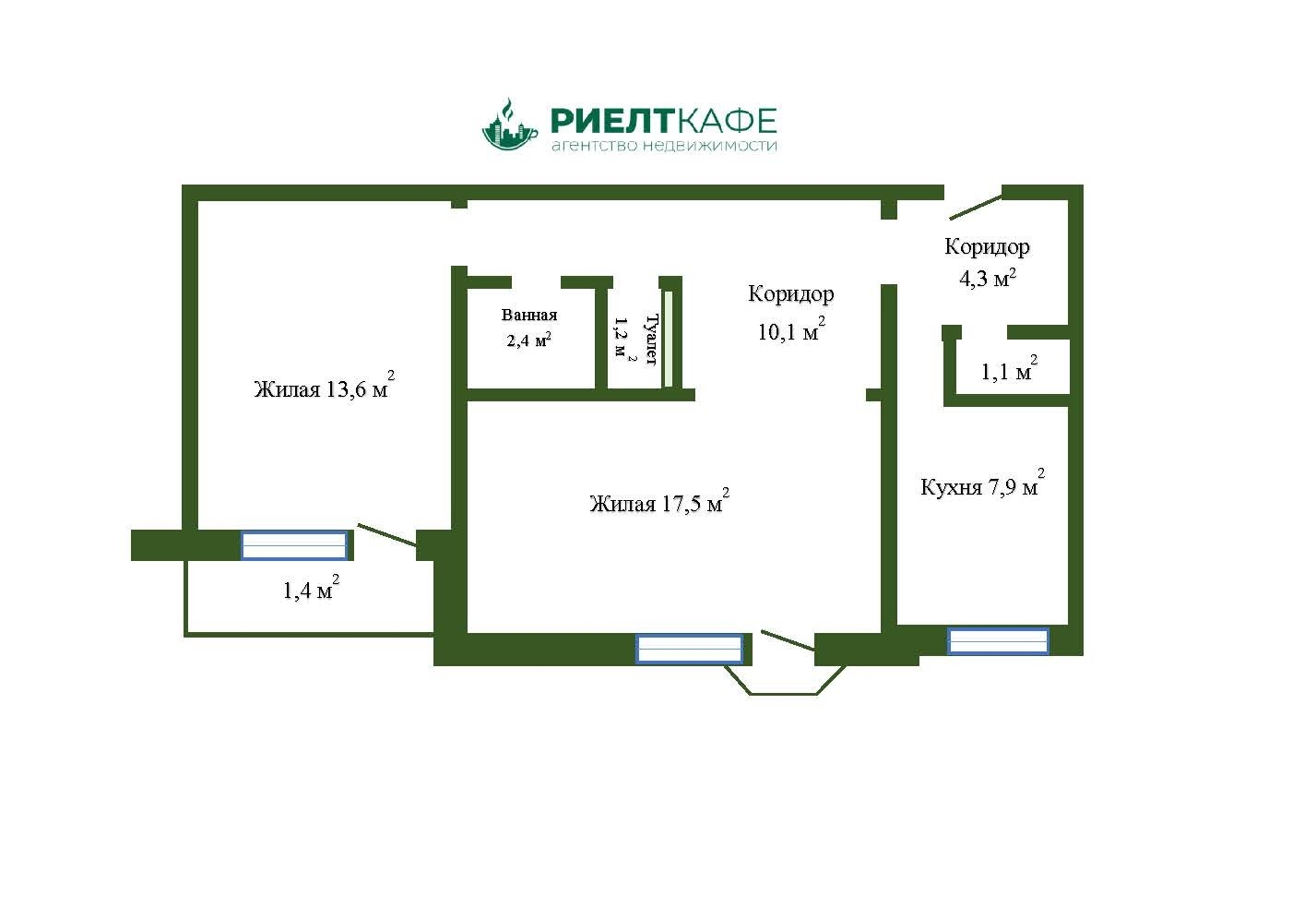 Общая площадь - 58,1м2, две изолированные комнаты: 17,5 м2, 13,6 м2, кухня 7,9 м2, кладовая 1,1 м2. Ванная комната 2,4 м2, туалет 1,2 м2 раздельные, сделан свежий ремонт с заменой всех коммуникаций.