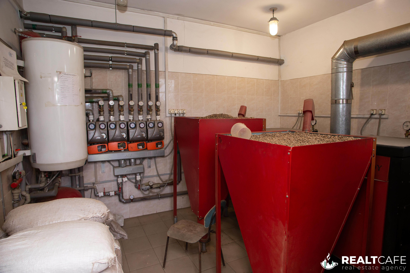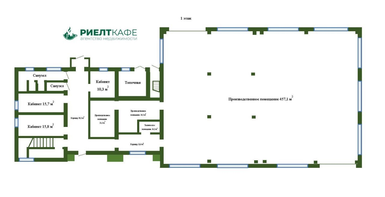 Первый этаж: производственный цех 457 м2, высота потолков 8,0 м. Двое подъемных секционных ворот, с возможностью заезда грузовых машин. Высота ворот 4,1 м, ширина 4,0 м.