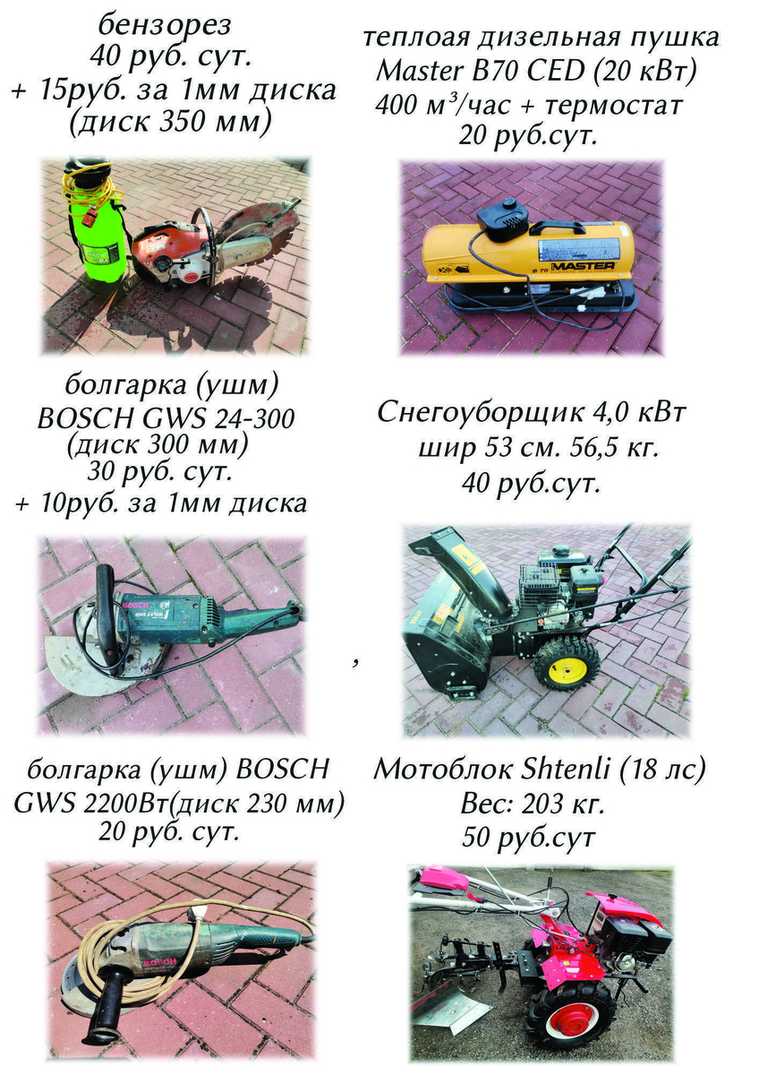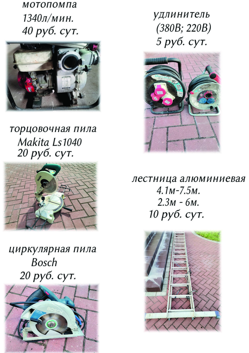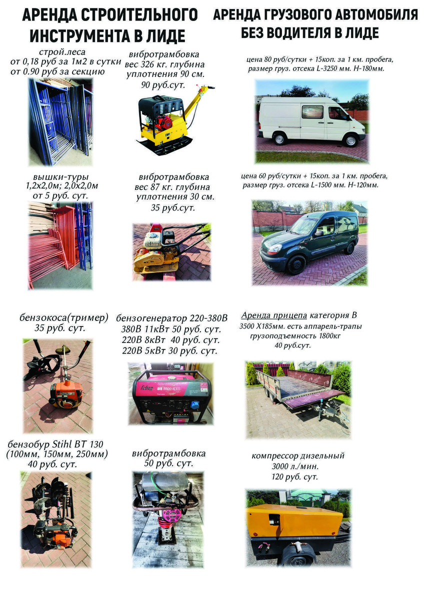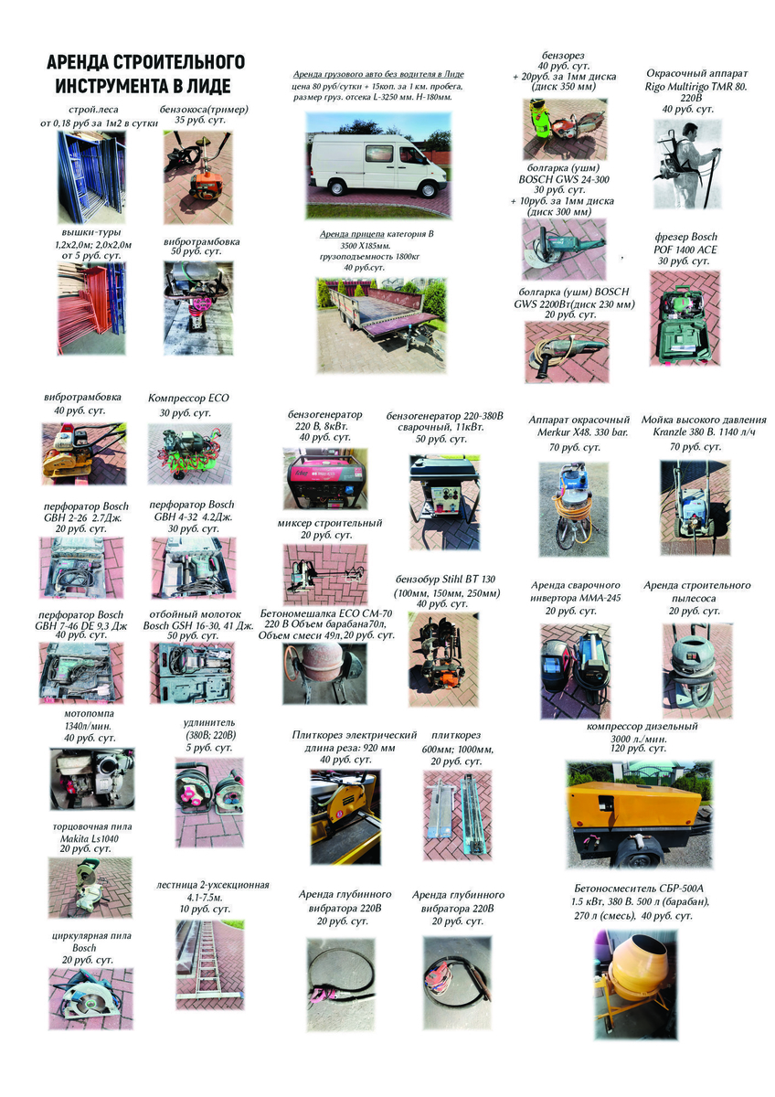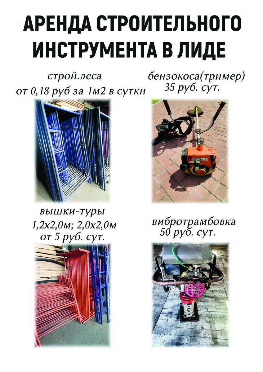 Аренда / прокат строительного инструмента и оборудования в Лиде на сутки и более. При себе иметь паспорт РБ. Работаем ежедневно, для заказа и по вопросам звоните 8(029)8664665. Самовывоз по адресу Тухачевского д3 (на против здания ГАИ)