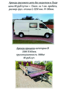 • аренда грузового авто без водителя Mercedes Sprinter размер груз. отсека L-3250 мм. H-180мм. При себе иметь паспорт РБ. права В кат. возраст от 24 лет - 80 руб/сутки + 15 коп. за 1 км. пробега,