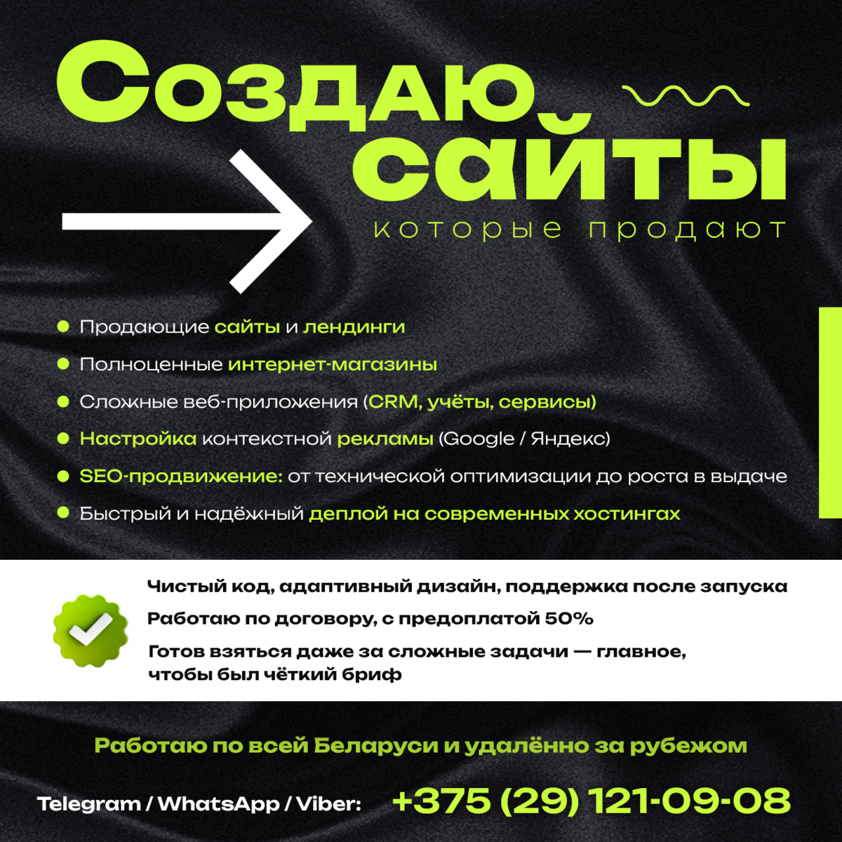 О SEO: Я не продаю «гарантии первых мест» — это зависит от конкуренции, региона и предмета запроса. Но большинство моих проектов действительно попадают в ТОП-3–ТОП-10 Google и Яндекса уже в первые 2–6 месяцев после запуска — особенно по коммерческим запросам средней и низкой конкуренции.
