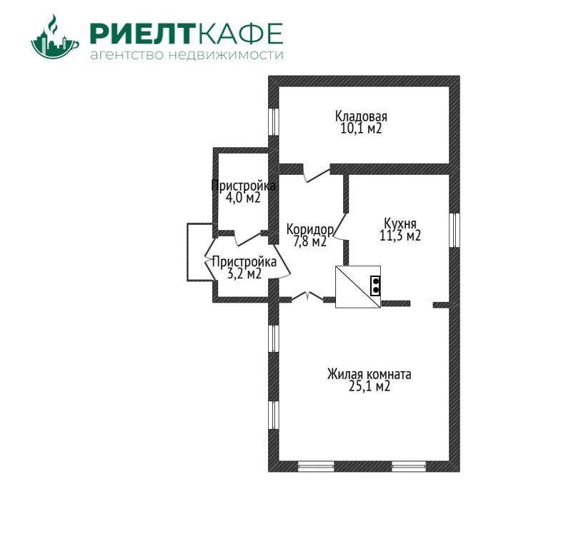 Общая площадь дома составляет 54,3 кв.м., жилая- 25,1 кв.м. и кухня- 11,3 кв.м.