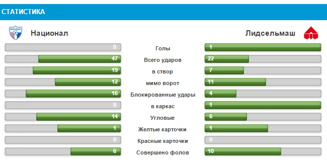 Фолы: 2 – 5, 3 – 5. Удары по воротам: 47 – 22 (21 – 11). Удары в створ: 19 – 7 (9 – 4). Угловые: 14 – 6 (9 – 3).