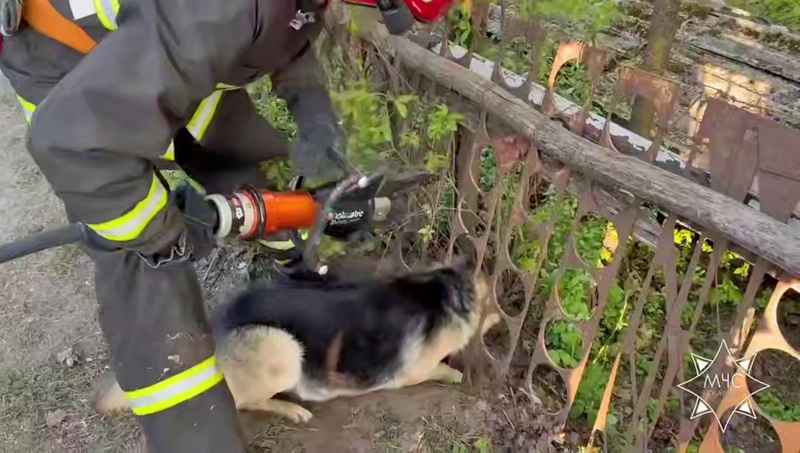 Прибывшие работники МЧС при помощи гидравлического инструмента освободили собаку. Животное не пострадало.
