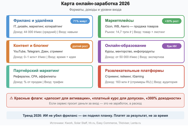 Интернет-заработок в 2026 году — это уже не «подработка для студентов». Для 50% фрилансеров в России это единственный источник дохода, ещё для 21% — основной. Среднемесячный доход вырос на 25% за год и достиг 44 тысяч рублей. Число соискателей, желающих работать удалённо, за год выросло на 92%. Рынок e-commerce превысил 14,7 триллиона рублей. Цифры говорят за себя: онлайн-экономика — это полноценный рынок с миллионами участников.