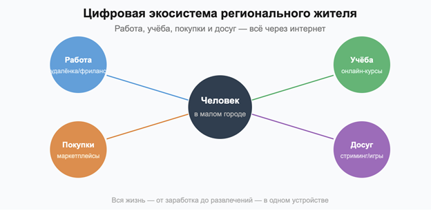 Это формирует новую экосистему: человек работает удалённо, заказывает еду через платформу, учится онлайн, развлекается в интернете. Весь жизненный цикл — от заработка до досуга — перемещается в цифровое пространство. И регионы включаются в эту экосистему всё быстрее.