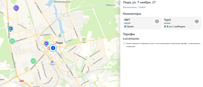 Сервис отслеживает статус зарядных станций крупных платформ — Malanka, BatteryFly, Evika, charge&go. Все станции нанесены на карту в виде точек с логотипом бренда. А при клике на точку можно увидеть адрес, допустимые типы коннекторов и мощность станции.