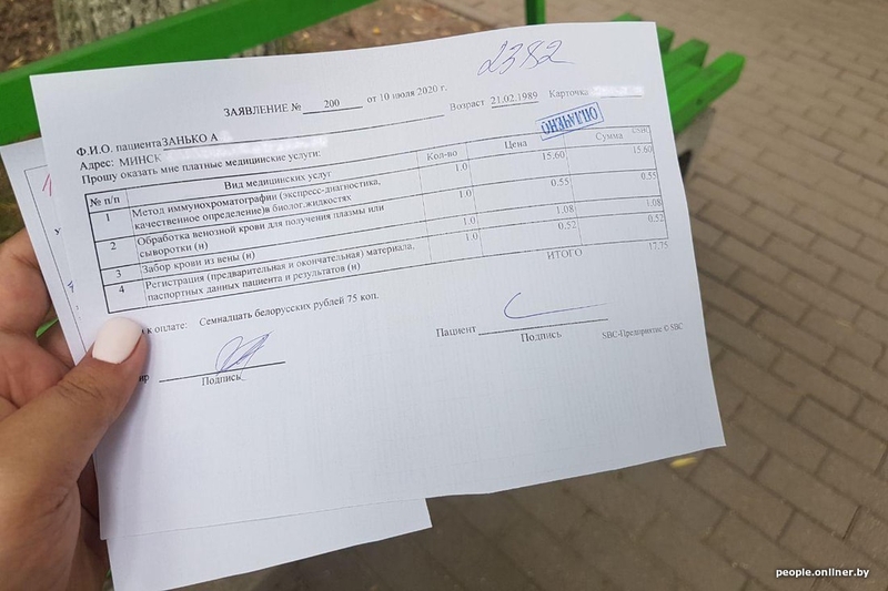 Ждать очереди пришлось 40 минут. Миловидная женщина в респираторе берет паспорт, оформляет договор на платные услуги и выбивает чек на 17,62 рубля. Столько здесь стоит тест.