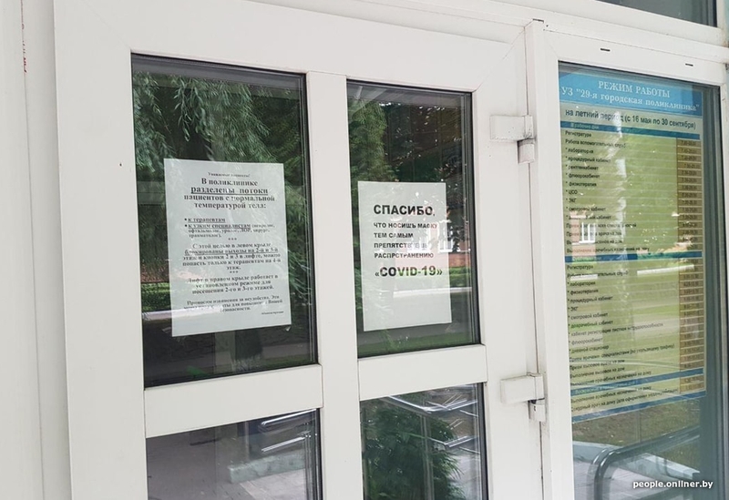 «Спасибо, что носишь маску, тем самым препятствуешь распространению COVID-19», — гласит объявление на дверях той самой поликлиники.