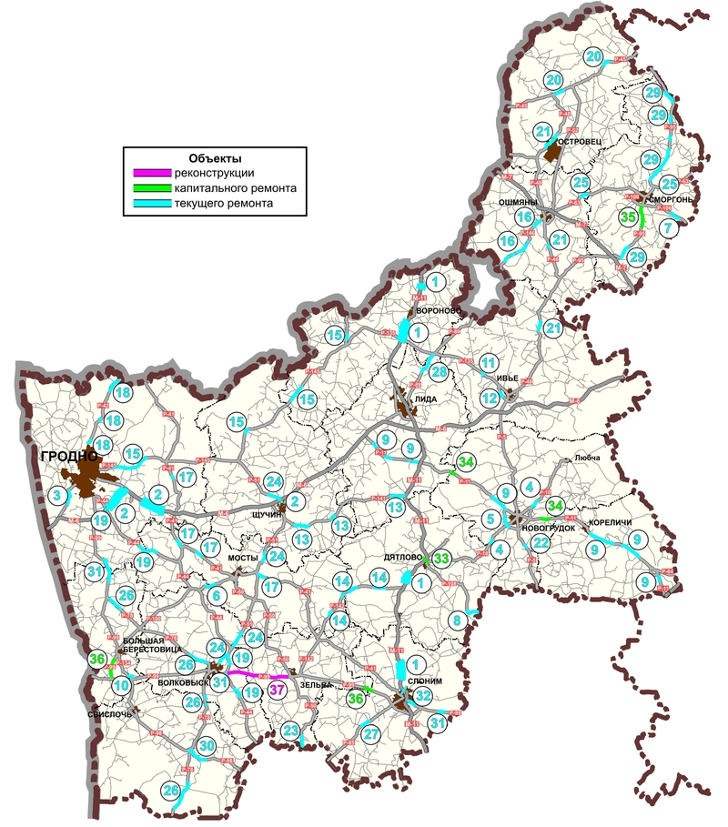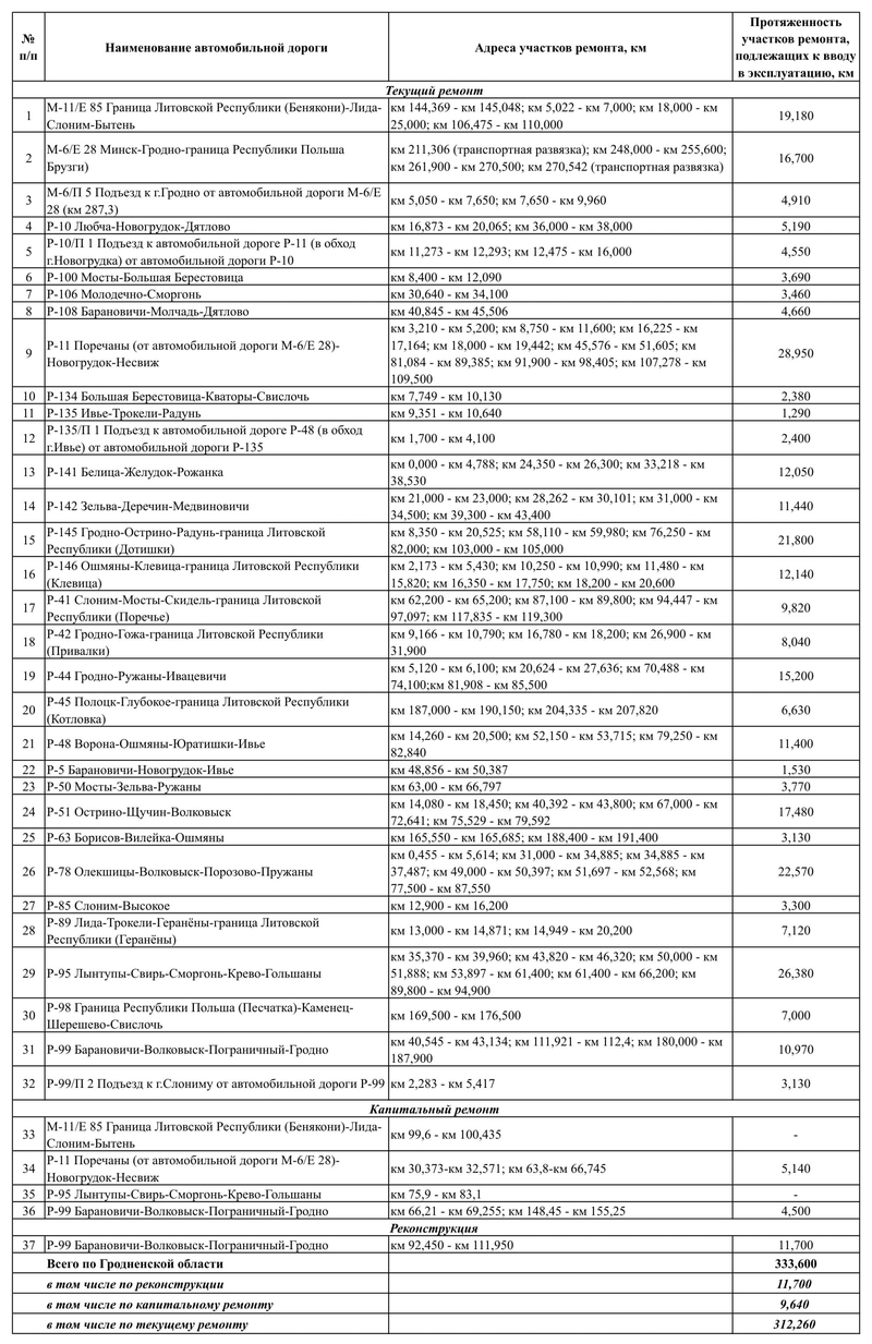 Список участков республиканских автомобильных дорог, планируемых к проведению дорожных работ в 2025 году по Гродненской области