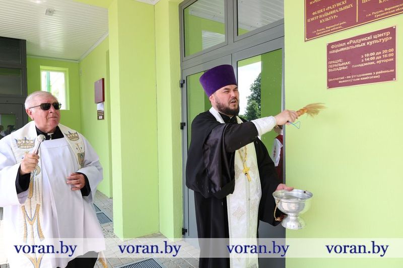 Символический ключ исполняющий обязанности директора Лидской ПМК-169 Дмитрий Почобут передал заведующему Радунским центром национальных культур Виталию Адамицкому. Освятили комплекс настоятели католического и православного храмов в городском поселке Радунь Станислав Пацына и Игорь Шулейко.