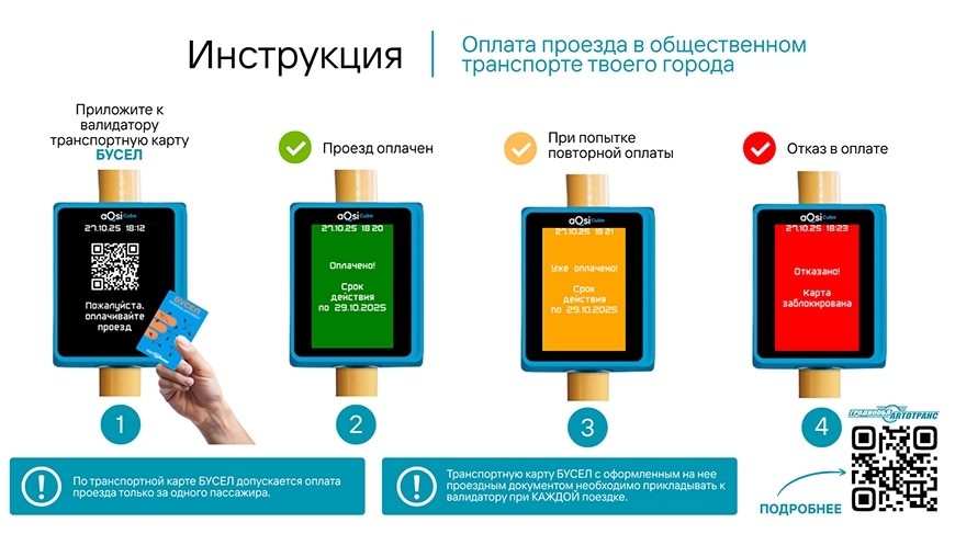 По транспортной карте «БУСЕЛ» допускается оплата проезда только за одного пассажира. При попытке оплатить проезд нескольких человек операция будет автоматически отклонена системой.