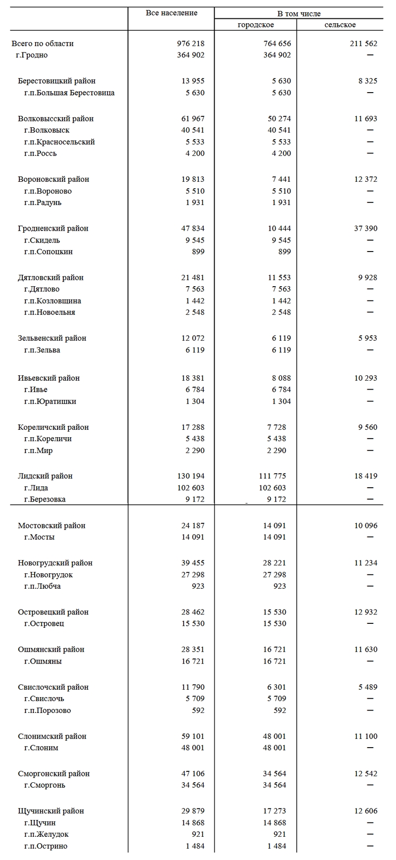 Таким образом, всего в Гродненской области насчитали 976218 ч. Наибольшие кол-во населения в Гродно — 364902 ч. В Лидском районе — 130194 ч., из них в Лиде — 102603 ч. и 9172 ч. в Берёзовке. В Вороновском районе — 19813 ч., из них в Вороново — 5510 ч., в Радуни — 1931 ч. В Новогрудском районе — 39455 ч., из них в Новогрудке — 27298 ч., в Любче — 923 ч. В Ивьевском районе — 18381 ч., из них в Ивье — 6784 ч., в Юратишках — 1304 ч. В Дятловском районе — 21481 ч., из них в Дятлово — 7563 ч., в Козловщине — 1442 ч., в Новоельне — 2548 ч. В Щучинском районе — 29879 ч., из них в Щучине — 14868 ч., в Желудке — 921 ч., в Острино — 1484 ч.