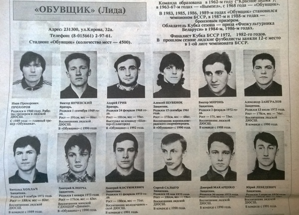 1980–е годы в чемпионате Белоруссии прошли под знаком футбольной Лиды. Эта команда на равных соперничала и с бобруйским «Шинником», и с солигорским «Шахтером», и с многочисленными минскими командами. Местный «Обувщик» четыре раза выигрывал чемпионат БССР и два раза — Кубок. В городе был настоящий футбольный бум!