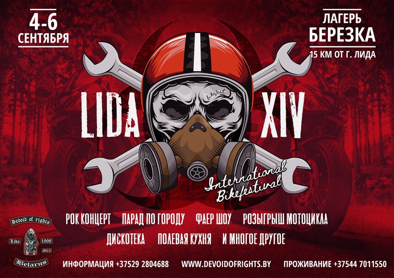 Мотоклуб Devoid of Rights MCC приглашает всех на XIV Лидский Байк Фестиваль, который пройдет 4-6 сентября в 15 км от г.Лида, на территории о.л. «Березка».