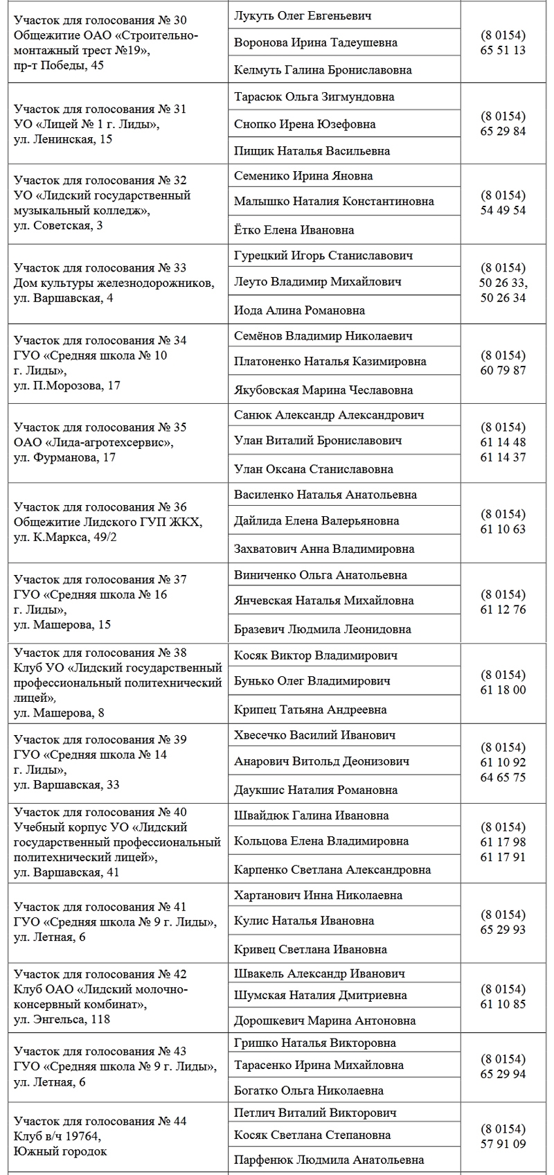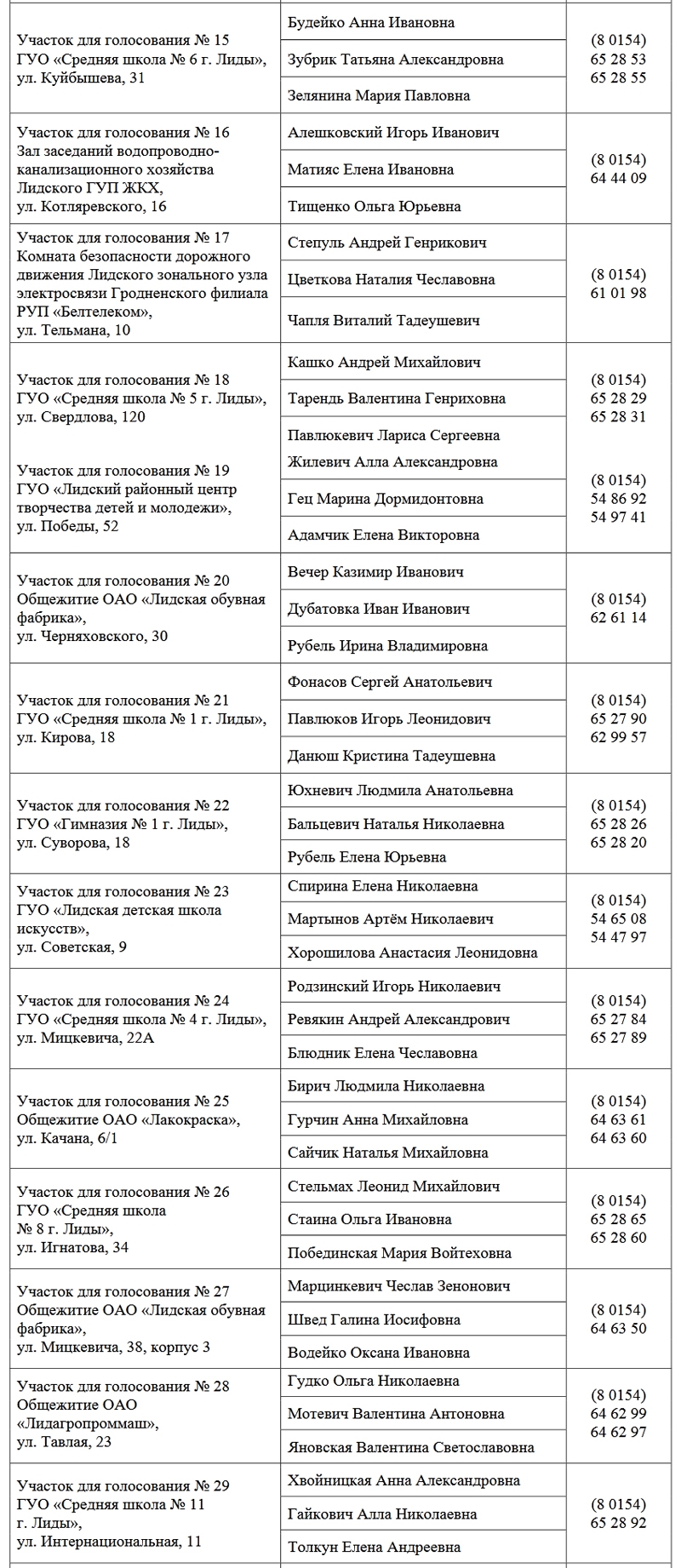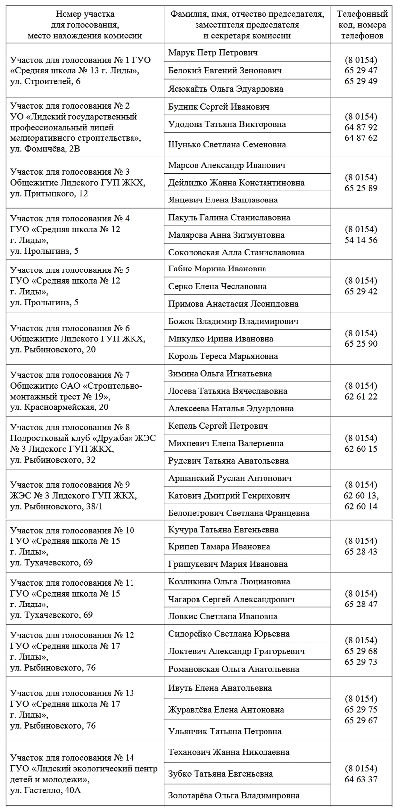 Списки членов избирательных комиссий, а также сведения о местонахождении и номерах телефонов участковых избирательных комиссий в Лиде для голосования за кандидатов в президенты РБ на выборах-2020.