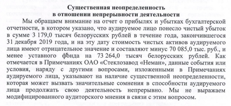 Аудиторское заключение по ОАО «Стеклозавод «Неман» опубликовано на Едином портале финансового рынка. Из документа следует, что у компании есть серьезные проблемы. Аудиторы сомневаются в ее жизнеспособности.