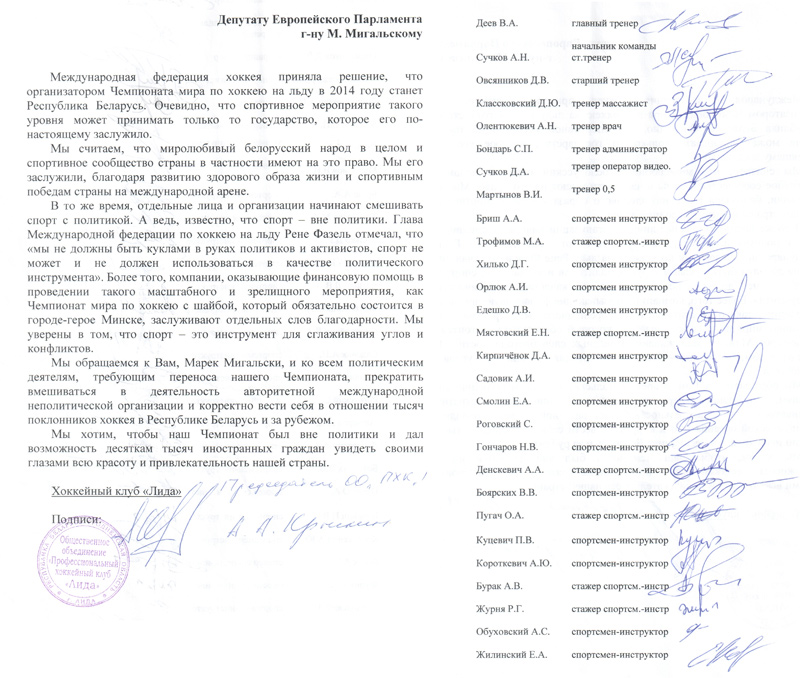 ХК «Лида» написал открытое письмо польскому депутату парламента ЕС Мареку Мигальскому, в котором клуб напоминает евродепутату о том, что спорт вне политики. Мигальски уже с 2011 года предпринимает постоянные попытки перенести Чемпионат Мира по хоккею-2014 в другую страну.